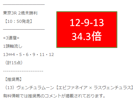 ここ最近微妙だった栗東会議ですが、日曜日に三連複15点で107.2倍が出ました!
