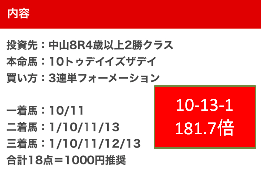 月1、2回は的中があるも最近は低配当続きだったうましーずですが、今週は日曜の中山8Rで181.7倍の三連単万馬券を的中