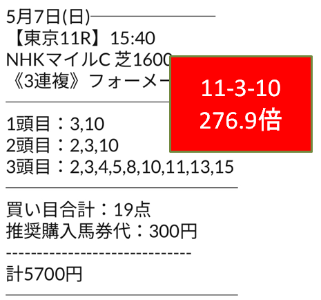 今回はヴィクトリアマイルを上位3頭三連単BOX(6点)で128.3倍の的中!