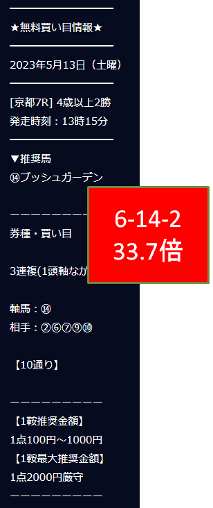 ブラインドGの無料情報は大抵午前のレースから選ばれることが多いのですが、土曜日は京都7Rを選び、33.7倍を的中