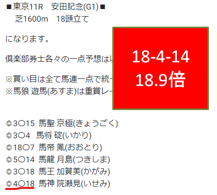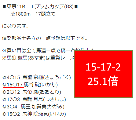 個人的に最近の期待値上位に入っている一点的中倶楽部ですが、今週はエプソムカップが提供され馬連25.1倍を見事的中!
