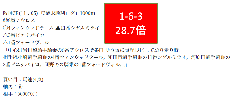これで今月は4の3的中。あとで月間のまとめも上げますが、好調ランキング入り間違いないでしょう!
