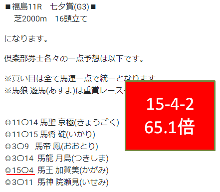 個人的に最近のイチオシである一点的中倶楽部ですが、先週は不的中だったものの今週は七夕賞にて馬連65.1倍を的中させています!