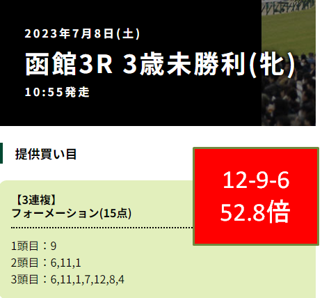地味ですが回収率133.9%で3位になったのはギャロップジャパンでした。函館7Rで三連複24.1倍を的中させています。