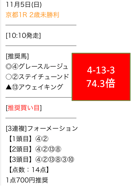 今週の1位は俺の競馬予想でした。先週も74.3倍を的中させていましたが、今週も土曜京都1Rにて三連複129.8倍を的中させています!
