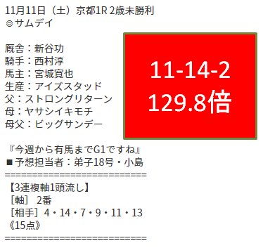- オウマナビ:土曜京都3R三連単71.6倍、日曜京都2R三連単42.5倍、いずれもフォメ1、2どちらも的中で高回収