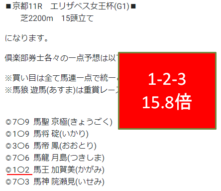 第3位は一点的中倶楽部。エリザベス女王杯で馬連15.8倍を的中です。