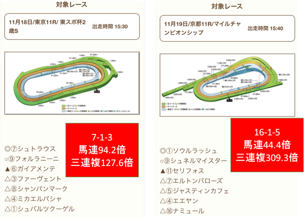 日曜は京都11RマイルCSで馬連44.4倍、三連複309.3倍という大的中を2日連続で決めました!