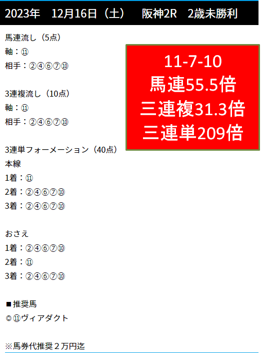 2位はギャロップジャパン。12/30で万馬券総合研究所への吸収合併が発表され、12/24(日)がラストの提供となりましたが、土曜阪神7Rにて三連複9点55.3倍を的中させています。