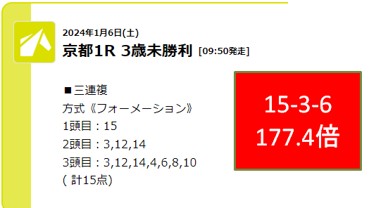 土曜京都1Rにて三連複177.4倍の高配当を的中!