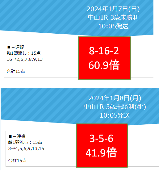 日曜中山1Rで三連複60.9倍、月曜も同じく中山1Rで三連複41.9倍を的中!