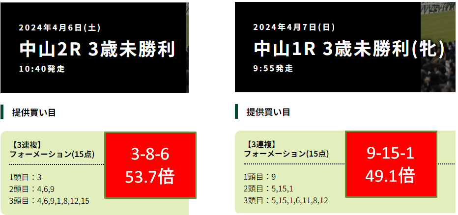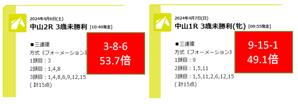 土曜は中山2Rで三連複53.7倍、日曜は中山1Rで49.1倍の的中と2日とも好配当という素晴らしい結果となりました。