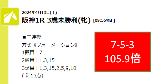 第3位はうまサプリ。土曜の阪神1Rで三連複105.9倍の万馬券を的中です!