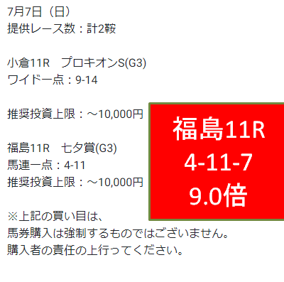 第3位は一点的中倶楽部。日曜の福島11R七夕賞にて馬連1点9倍を的中です!