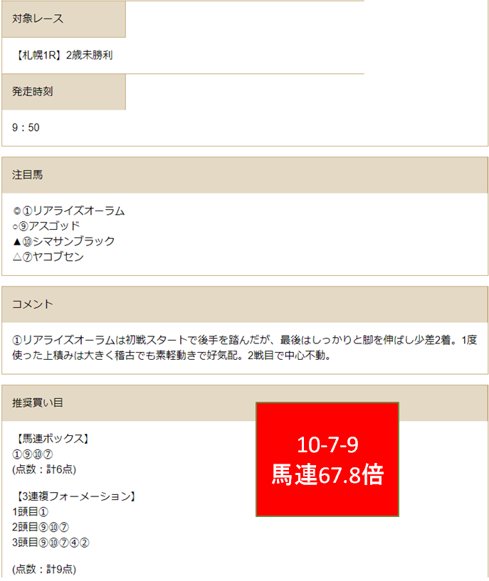 他サイトもリアライズオーラムを軸にしていたので外していたのですが、HRICだけは馬連BOX提供もあったので助かった形になっています。
