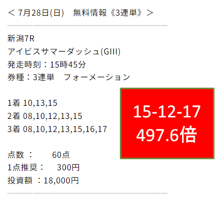 第2位はスター競馬。土日ともに複勝・三連単の提供でしたが、4鞍中3鞍的中。そして日曜新潟7RアイビスSDにて三連単60点497.6倍を的中させています!!