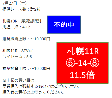 7月4週目の結果です。最終週です。新潟・札幌の2場開催で重賞はアイビスSDとクイーンSが行われました。