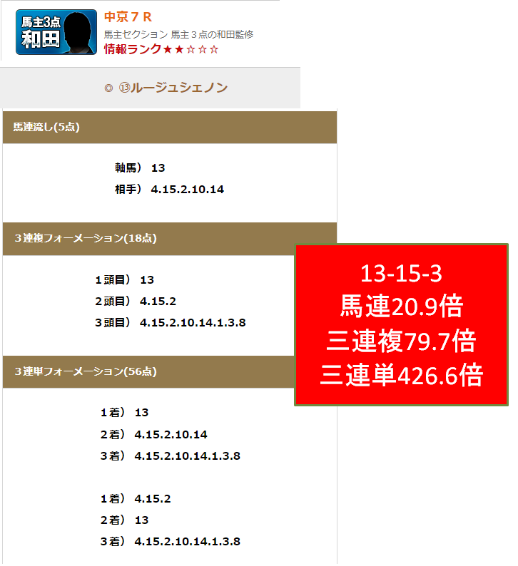 今週の1位は情報競馬マスターズでした。土曜の中京7Rにて三連単426.6倍の高配当を的中させています。