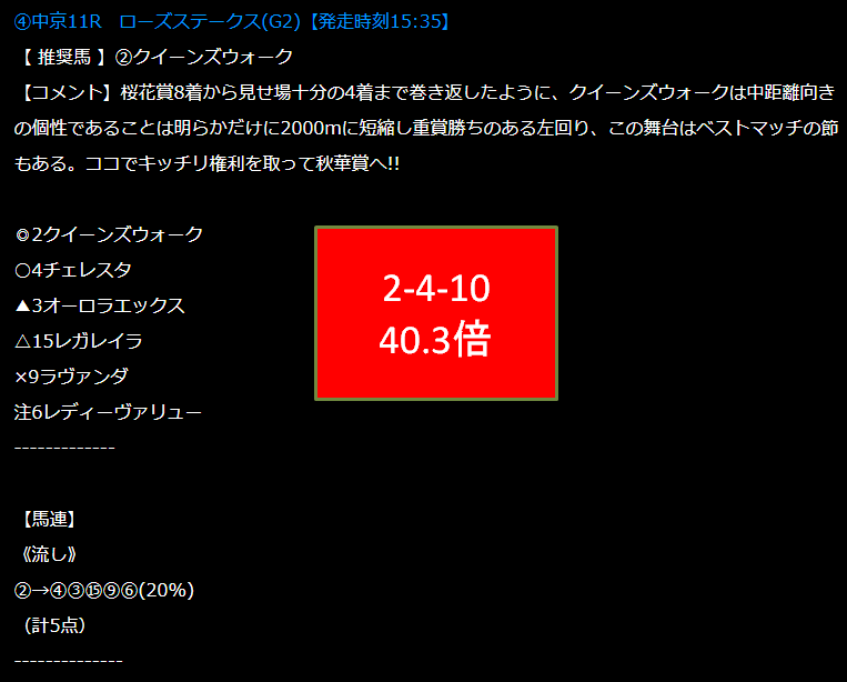 1番人気のレガレイラを本命にしているサイトが多い中、2番人気のクイーンズウォークから行って○のチェレスタもバッチリと捉えています。これは素晴らしいですね。高配当21にしては珍しく高配当となりました。(失礼)