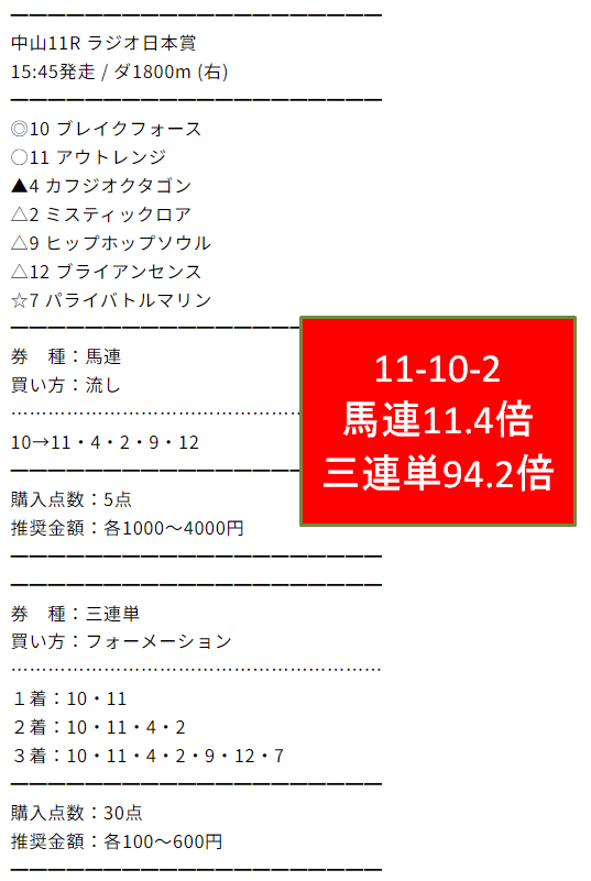 第3位はウマっち×ウマっち。いくつか的中がありましたが、一番良かったのは日曜中山11Rの三連単94.2倍の的中でした。