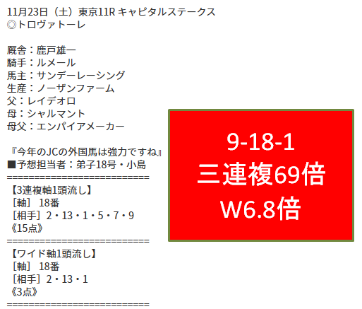 - スター競馬:ジャパンカップ三連単60点189.4倍的中!同着に救われた。2週連続G1的中
