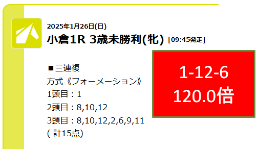 うまサプリが今週の1位。日曜の小倉1Rで三連複120倍の万馬券を的中させています。