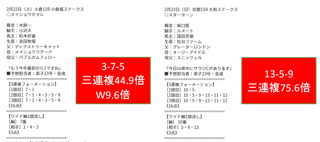 2月4週目(2/22、23)の無料情報結果です。今年初のG1フェブラリーSが開催されました。