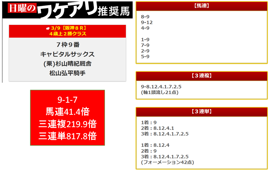 3月2週目(3/08、09)の無料情報結果です。重賞は弥生賞など3つもありましたね。